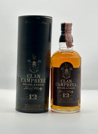 Eine 12 Jahre alte Flasche Clan Campbell Highlander Whisky. Destilliert, gereift und abgefüllt von Muir Mackenzie & Co. Verkostungsnotizen Nase: Leicht grasig mit Orangenschale. Sattelkraut und getrocknetes Heidekraut, aber auch ein Hauch von Lösungsmittel. Mit Wasser wird er etwas duftender – Geranien, Holzpolitur. Ziemlich vollmundig, aber auch trocken. Gaumen: Die Eiche ist gut poliert und vielleicht etwas zu dominant. Doch dahinter verbirgt sich eine gelungene Mischung aus reifen, dunklen Früchten und Walnuss. Abgang: Fruchtig, dann trocken.